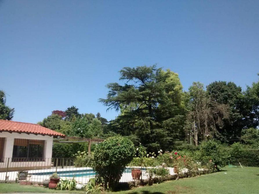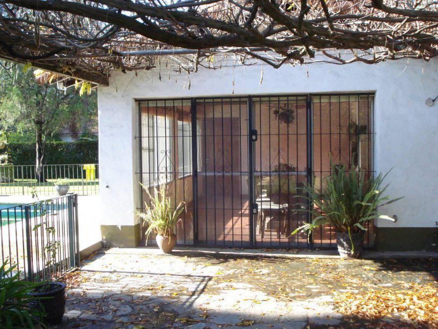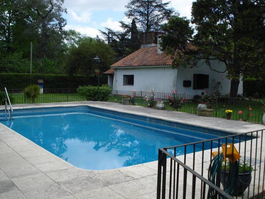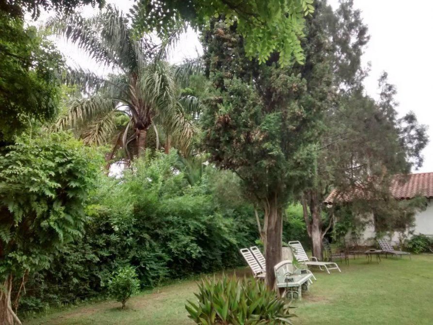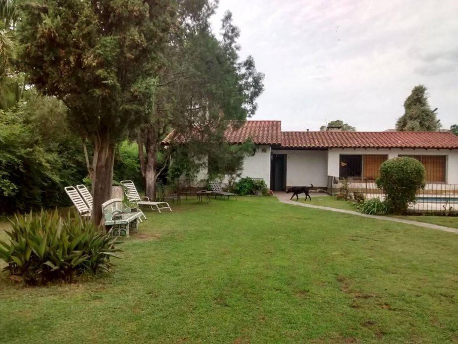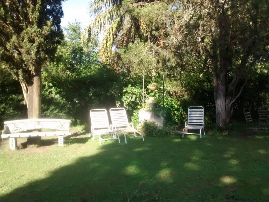En el exterior de la casa nos encontramos con un parque con añosa arboleda con cerco perimetral y ligustrina, un gran quincho totalmente cerrado con lugar para 18 personas, con mesas y sillas de algarrobo, bajomesada, anafe a gas, heladera, estufa, arañas de hierro forjado y ventilador de techo. Una piscina de 10m X 5m X 2 de profundidad (con desborde) revestida con venecitas con baldosas atérmicas alrededor, reja perimetral y lugar para poner reposeras. Y un quincho de paja de 7m X4m para guardado de vehículo.