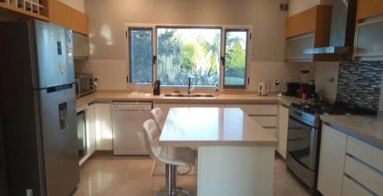 La cocina cuenta con vista hacia el frente de la vivienda, cuenta con una hermosa isla, muebles bajo mesada y alacena laqueados, y mesada de silestone.