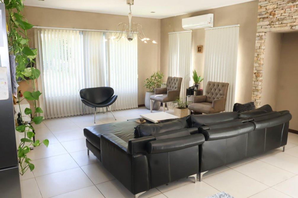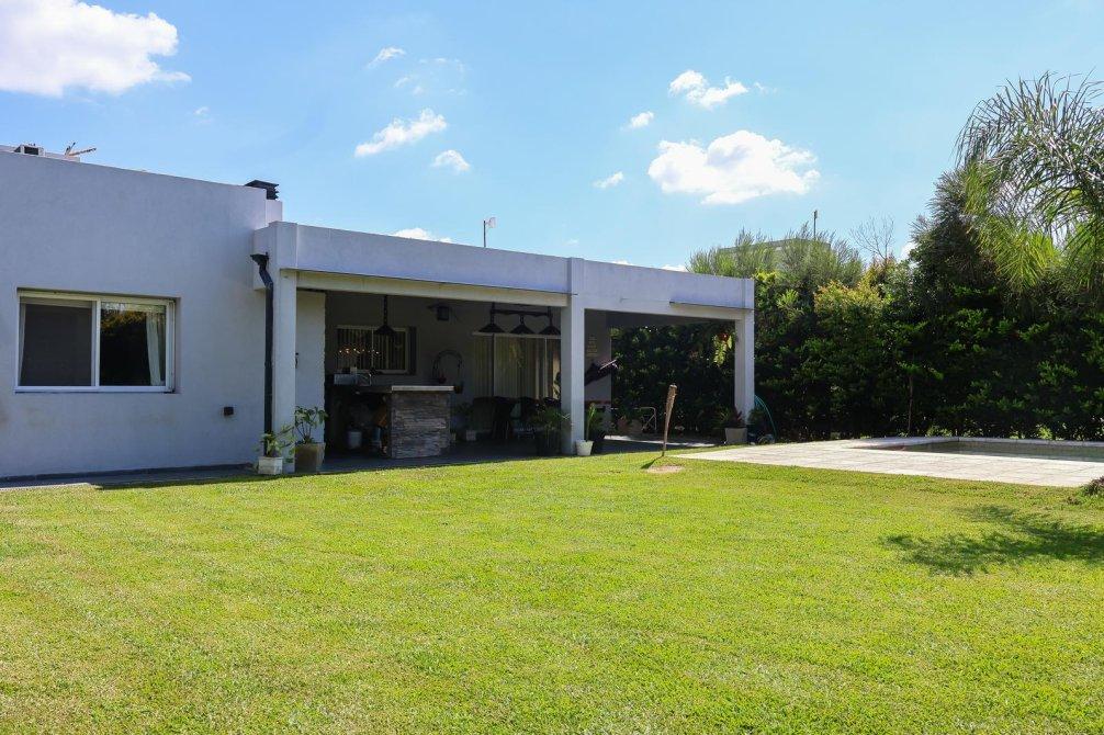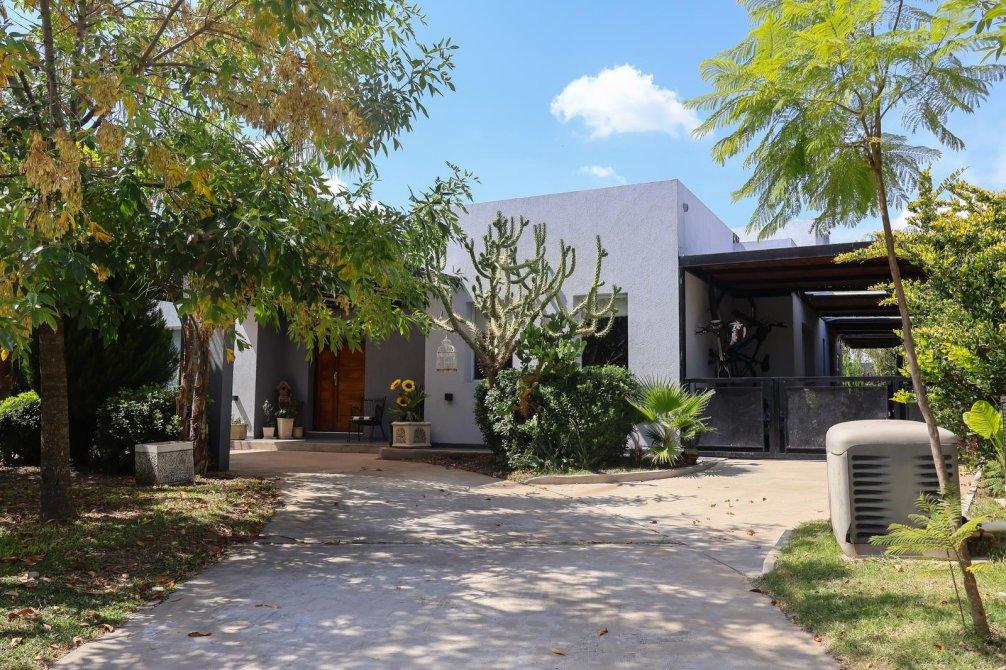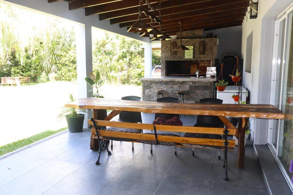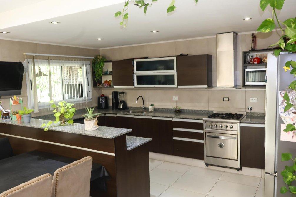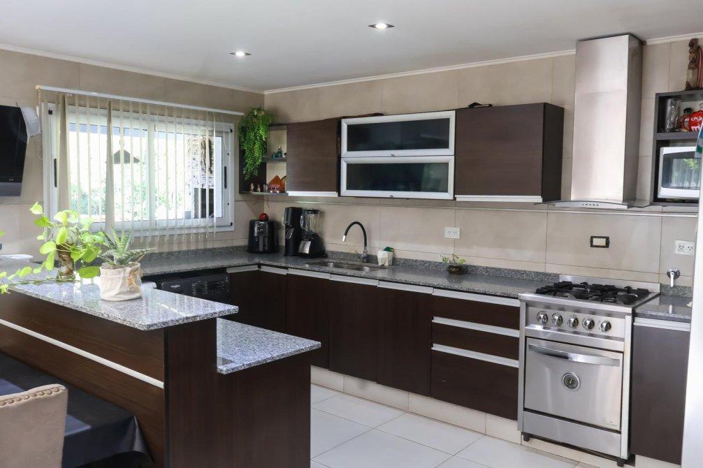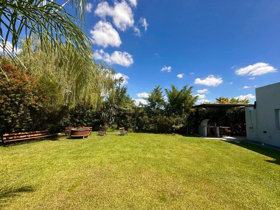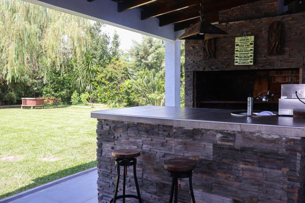 En el exterior, la casa sorprende con un espectacular quincho equipado con parrilla, isla y un baño exclusivo para esta área. La piscina, revestida en venecitas, se integra armoniosamente con el hermoso parque forestado, que cuenta con sistema de riego automático. Además, en el parque se encuentra un horno de barro, ideal para disfrutar de asados y comidas caseras al aire libre.