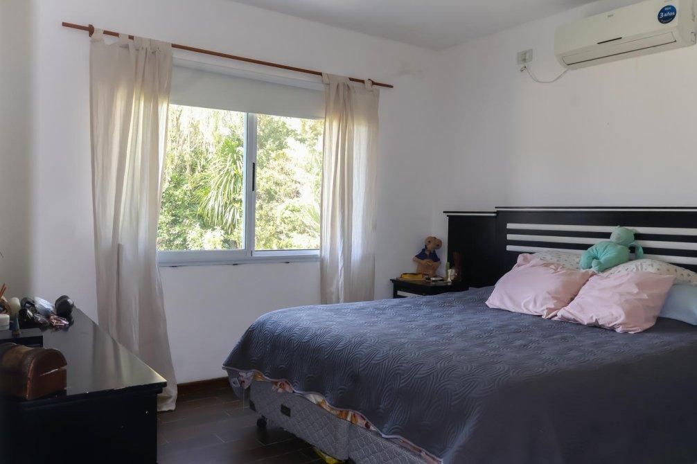 La distribución interior incluye un toilette de recepción y tres dormitorios, destacándose la suite principal con vestidor, baño privado y doble bacha. Las otras dos habitaciones comparten un baño completo, diseñado para el máximo confort. La calefacción es por radiadores y la casa cuenta con aires acondicionados en todos sus ambientes, asegurando una temperatura ideal en cualquier época del año.