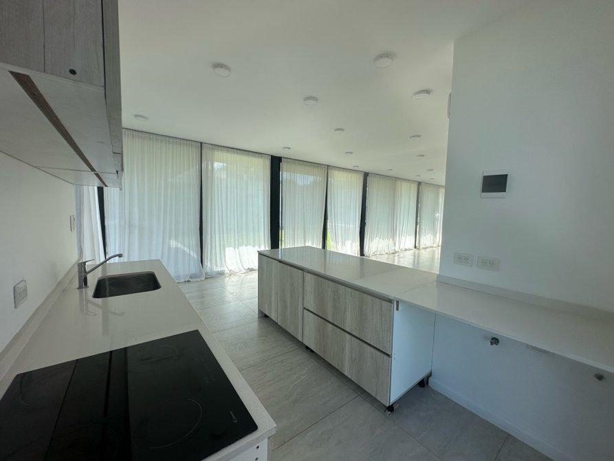 Cocina moderna con isla: Equipada con espacio para lavavajillas y lavarropas, anafe eléctrico y horno a gas, integrada al living.